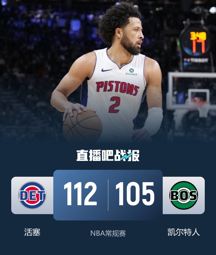 比赛开始,双方就在外线对飙,随后活塞7-0后突然断电陷入5分钟得分荒,杰伦·布朗带队轰14-0反超比分,首节绿军领先8分,次节康宁汉姆里突外投带队追平比分,随后双方胶着拉锯战,比分多次打平,半场绿军依然领先4分。下半场,双方继续胶着拉锯战,怀特找到手感,但康宁汉姆依然能带队咬住,勒韦尔站出来连得8分助活塞反超4分,末节活塞替补发力一度领先到近10分,但凯尔特人还能咬住,普理查德关键三分三不沾,最终活塞112-105力克凯尔特人,拿到4连胜。
