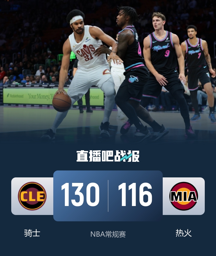 一开场,鲍威尔手感火热连得8分,骑士轮番冲击内线频频得手努力追赶,热火多点开花占据场上主动,次节骑士火力全开,连续打出进攻高潮不断迫近比分并抹平分差,热火延续火力止住颓势,半场战罢热火69-66领先骑士。下半场,双方继续缠斗,比分始终紧咬,鲍威尔依然连投带罚拿分,阿伦高效发挥还以颜色,末节热火突然断电,骑士轰出19-5的进攻高潮强势反超,热火后劲不足,骑士越战越勇,最终,骑士末节逆转以130-116击败热火,客场过关。